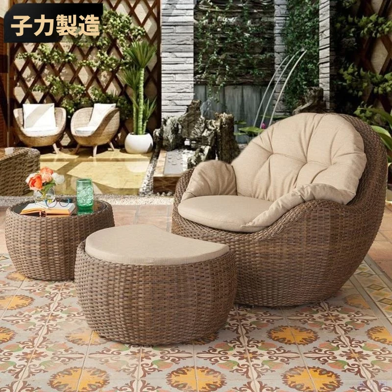 子力北欧スタイルのアウトドア家具!バルコニーやガーデンにぴったりなラタン製ソファとテーブルのセット。おしゃれで快適な一人用リラックスチェアで、素敵なひとときをお楽しみください。