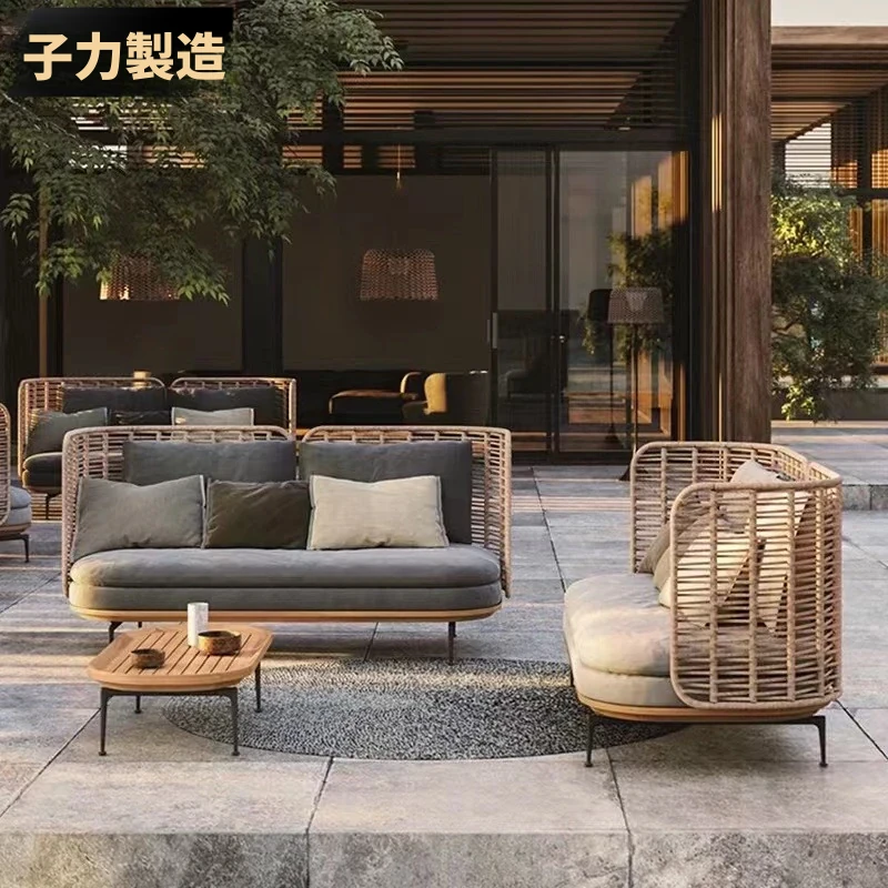 子力アウトドアソファ ガーデン ホテル用 テラス用 ユーカリウッド・ラタン製家具 セット販売 ヴィラ・モデルルーム向け 防腐加工済み家具で快適なひとときを提供!