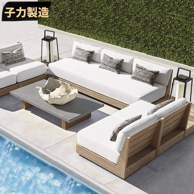 子力のティークウッド製アウトドアソファー - ヴィラ庭園テラス用のスタイリッシュな家具!防腐加工の実木製テーブルとデザイナーチェアで、陽光の下でのリラックスしたひとときをお楽しみください。