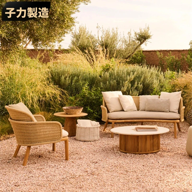 子力アウトドアラタンソファー|高級感あふれる無垢材使用の庭園デザイン|ヴィラやホテルにぴったりなチーク製ラタンチェア|陽光室やガーデンに最適な家具!