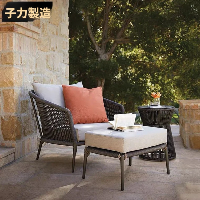 子力北欧デザインのアウトドアリラックスソファ - テラスや庭にぴったりなロープ編みのラタンチェア!洗練されたインテリアで、快適なひとときを提供します。おしゃれなサンルームの必需品です!