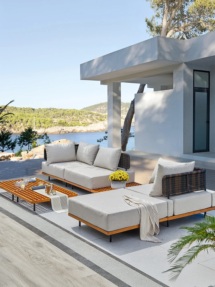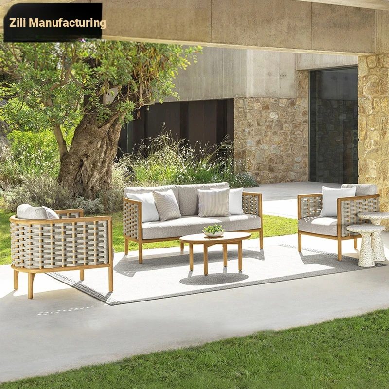 Zili Outdoor Sofa Set - Aluminum Alloy & Teak Garden Furniture for Villas and Hotels, Featuring Stylish Rattan Chairs and a Chic Coffee Table for Your Patio or Backyard.
